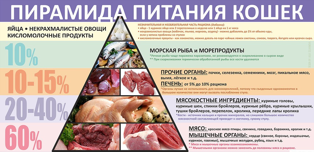 Если планируется кормить натуральной едой, важно не забывать, что пищей со стола кормить запрещено. Выбирайте постные сорта мяса, например, индейку или крольчатину, но только в отваренном виде, субпродукты, куриный желток и перепелиные яйца. Дополняйте рацион вареными или запеченными овощами, изредка балуйте вареной речной рыбой с минимальным содержанием костей. Запомните, что кости вообще очень вредны для кошек, ведь их осколки могут проткнуть или поцарапать пищевод животного. А вот морская рыба и морепродукты за счет большого содержания в них йода способствует потемнению шерсти. Допускается нежирный творог.
