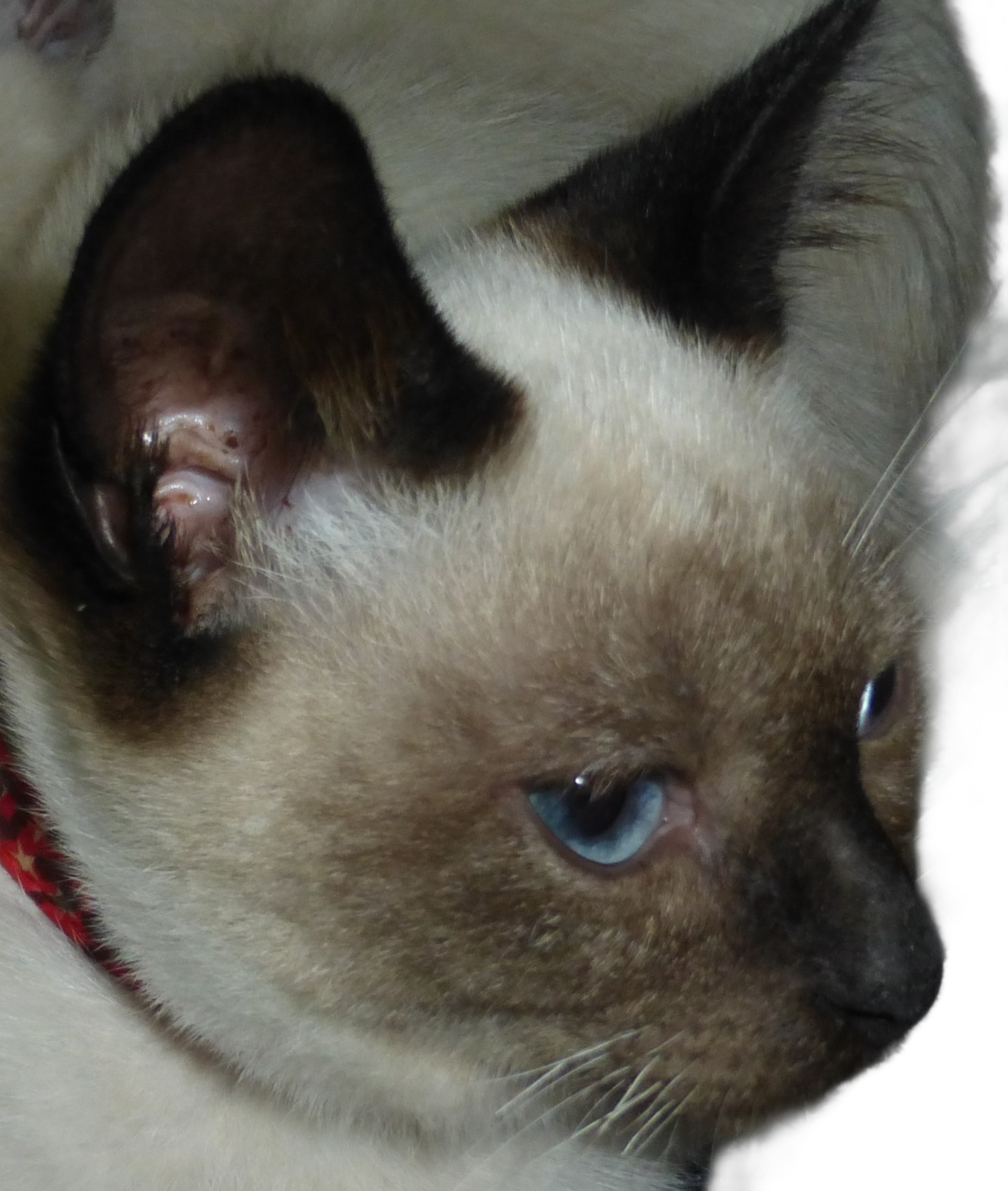 Глаза: У тайских кошек умеренные выделения из глаз, поэтому какого-то специального осмотра и ухода не требуется, ведь каждый владелец хотя бы раз в день да посмотрит на мордочку своего питомца. Если в слезных дорожках появились выделения (это смытая глазом грязь и пыль), их следует удалить бумажной салфеткой или мягкой не ворсистой тканью (ворс на ткани или волокна ваты могут поцарапать чувствительную слизистую глаза кошки). Если выделений из глаз нет или они стали обильными, то питомца необходимо показать ветеринару.